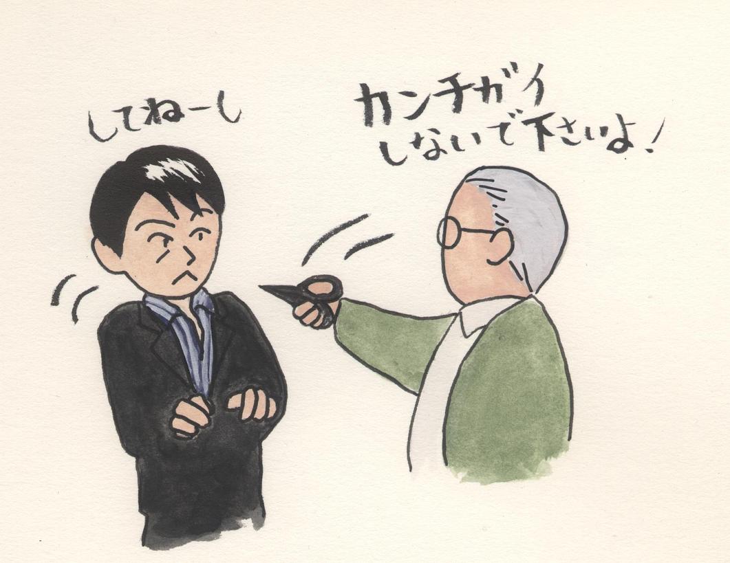 ・第一発見者のじいさんからハサミを突き付けられてびびる尊くん。
